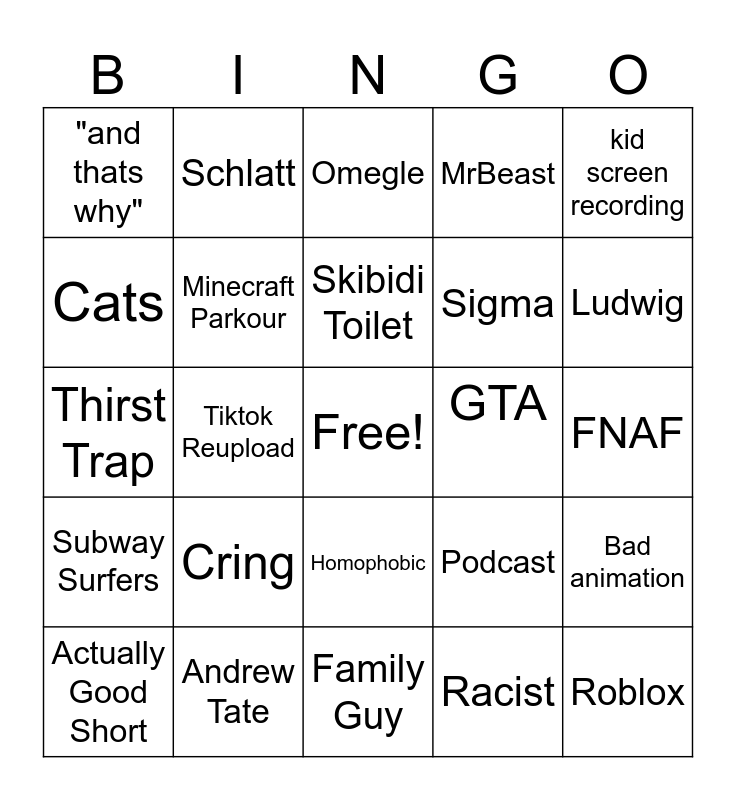 This bingo card has a free space and 24 words: Cring, Andrew Tate, Skibidi Toilet, Actually Good Short, kid screen recording, "and thats why", Cats, Schlatt, GTA, Homophobic, Sigma, Thirst Trap, Podcast, Bad animation, Minecraft Parkour, Racist, FNAF, Omegle, Ludwig, Tiktok Reupload, Roblox, Subway Surfers, MrBeast and Family Guy.