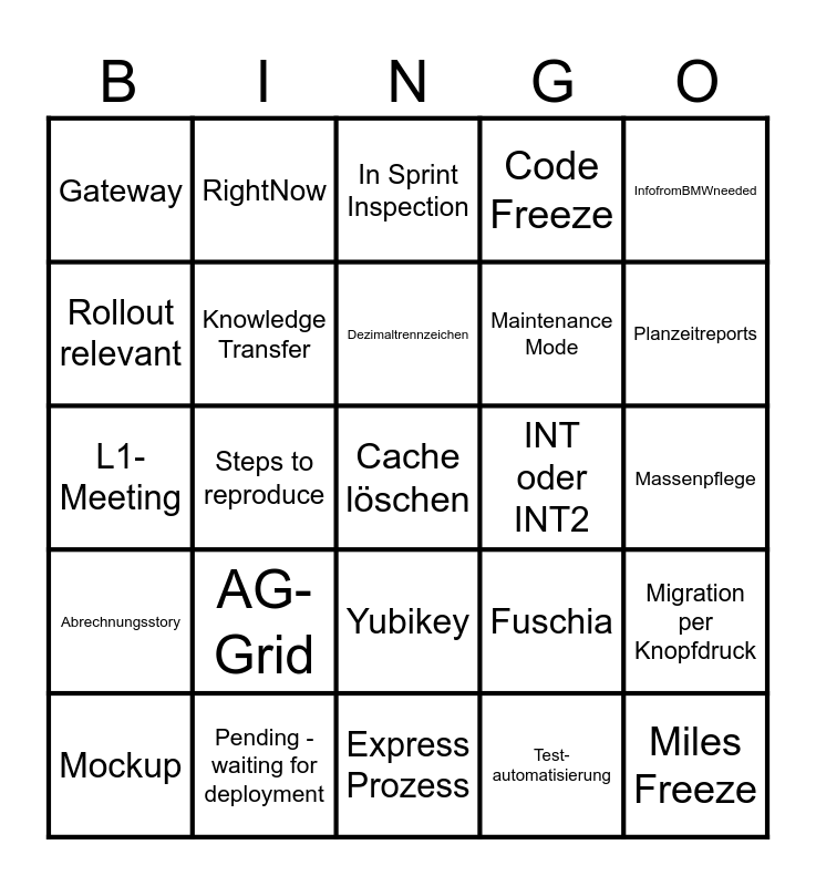 This bingo card has 42 words: Regression, Dezimaltrennzeichen, Internationalisierung, AG-Grid, Test-automatisierung, Migration per Knopfdruck, Cache löschen, XL, In Sprint Inspection, Yubikey, Massenpflege, Planzeitreports, Steps to reproduce, InfofromBMWneeded, Spec-Lücke, Fuschia, Streifenkarte, L1-Meeting, Schattenwerk, RightNow, Rollout relevant, Usability, Miles Freeze, Gateway, POC, TobeSplitted, Maintenance Mode, Cutover Plan, Kein Non-Backlog, Server is down, Service Katalog, Abrechnungsstory, Knowledge Transfer, Express Prozess, Work Shadowing, Mockup, Pending - waiting for deployment, INT oder INT2, Release verschieben, Komplexitätstreiber, Code Freeze and Pre-Planning.