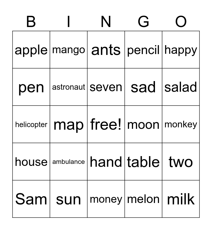 This bingo card has a free space and 29 words: Sam, Pam, map, hat, apple, ants, astronaut, ambulance, moon, sun, monkey, milk, money, melon, salad, sandwich, hand, house, happy, helicopter, table, teacher, sad, pen, pencil, mango, two, seven and ten.