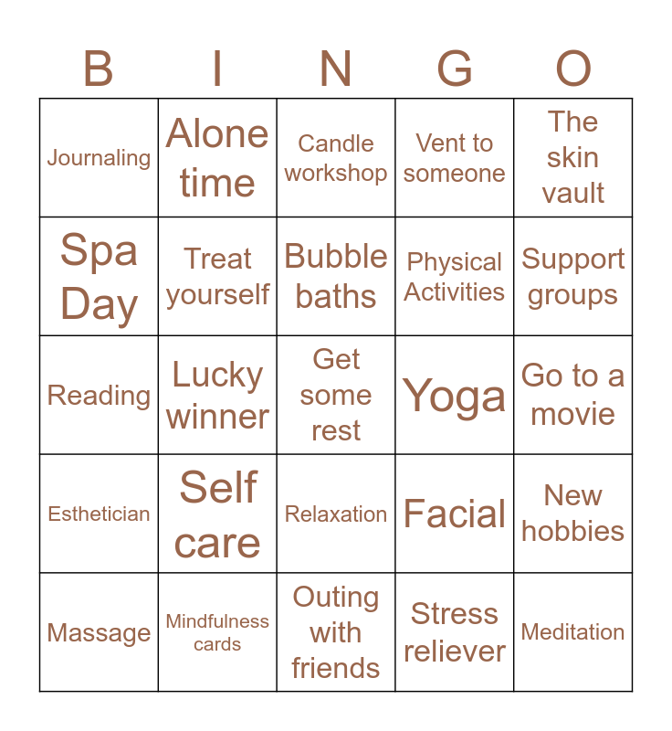 This bingo card has 25 words: Self care, Outing with friends, Bubble baths, Massage, The skin vault, Journaling, Spa Day, Alone time, Yoga, Relaxation, Physical Activities, Reading, Facial, New hobbies, Treat yourself, Meditation, Go to a movie, Candle workshop, Support groups, Lucky winner, Get some rest, Mindfulness cards, Esthetician, Vent to someone and Stress reliever.