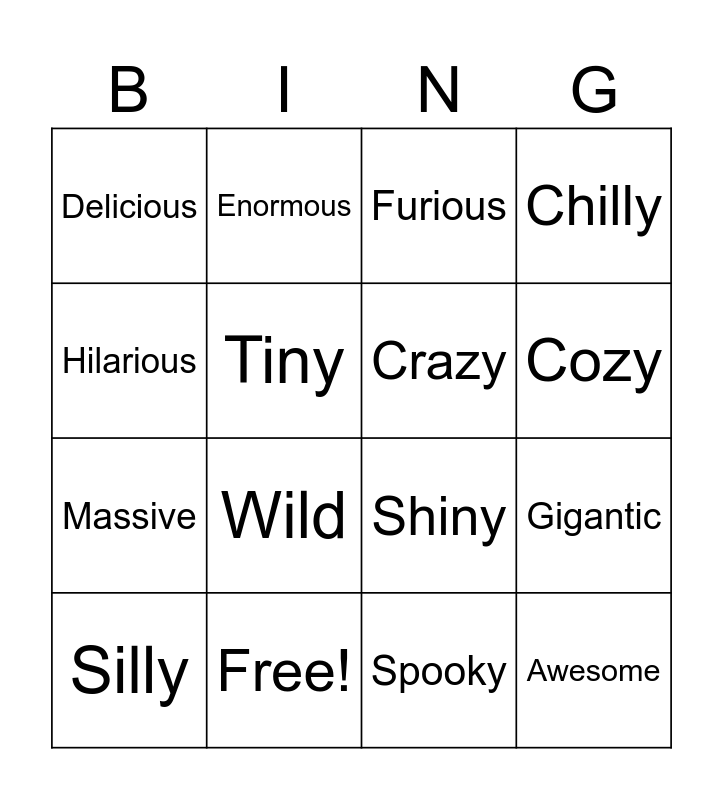 This bingo card has 21 words: Free!, Happy, Enormous, Clever, Spooky, Crazy, Delicious, Furious, Shiny, Cozy, Massive, Chilly, Awesome, Mysterious, Tiny, Beautiful, Silly, Wild, Hilarious, Gigantic and Bright.