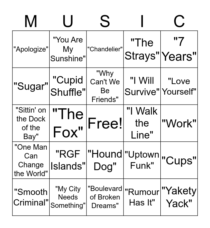 This bingo card has a free space and 24 words: "RGF Islands", "My City Needs Something", "Why Can't We Be Friends", "Smooth Criminal", "7 Years", "Apologize", "Sugar", "You Are My Sunshine", "I Walk the Line", "Hound Dog", "I Will Survive", "Sittin' on the Dock of the Bay", "Uptown Funk", "Cups", "Cupid Shuffle", "Rumour Has It", "Work", "Chandelier", "Love Yourself", "The Fox", "Yakety Yack", "One Man Can Change the World", "The Strays" and "Boulevard of Broken Dreams".