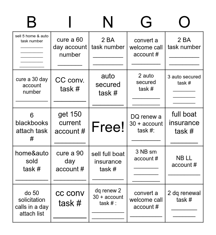 This bingo card has a free space and 25 words: cure a 90 day account # _________, dq renew 2 30 + account task # : ___________ ___________, auto secured task # ________, do 50 solicitation calls in a day attach list, 2 BA task number _________ _________, sell 5 home & auto task number __________ __________ __________ __________ ___________, cure a 30 day account number ___________, cure a 60 day account number _______, DQ renew a 30 + account task #: _________, sell full boat insurance task # _________, 2 auto secured task # _________ _________, 6 blackbooks attach task #, 3 NB sm account # ________ ________ _________, NB LL account # __________, CC conv. task # ________, 4 conv check conv task number ________ ________ _________ _________, full boat insurance task # _______, 2 BA task number _________ _________, 3 auto secured task # ________ ________ ________, get 150 current account # ________, 2 dq renewal task # ________ _______, cc conv task # _______, home&auto sold task # _________, convert a welcome call account # _________ and convert a welcome call account # __________.