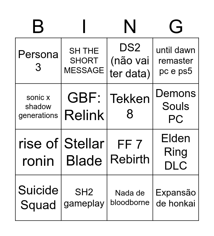 This bingo card has 18 words: sonic x shadow generations, SH2 gameplay, DS2 (não vai ter data), until dawn remaster pc e ps5, rise of ronin, SH THE SHORT MESSAGE, FF 7 Rebirth, Demons Souls PC, Persona 3, Stellar Blade, Nada de bloodborne, Elden Ring DLC, Suicide Squad, GBF: Relink, Tekken 8, Expansão de honkai, Genshin impact and Nada de bloodborne.