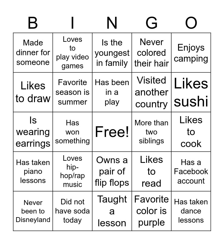 This bingo card has a free space and 68 words: Is wearing blue, Has taken dance lessons, Likes tomatoes, Has a pet, Plays a musical instrument, Speaks two languages, Loves to play video games, Has broken a bone, Has been in a play, Loves to swim, Owns a pair of flip flops, Has been to camp, Likes to cook, Enjoys camping, Has been to the ocean, Likes to draw, Has won something, Made dinner for someone, Is the oldest child, Loves hip-hop/rap music, Visited another country, Likes to read, Has taken piano lessons, Sings in a choir, Has painted toenails, Has gone roller blading, Has run a 5K, Has run a half marathon, Has a Facebook account, Has baked bread, Is the youngest in family, Has had stitches, Has brown eyes, Has naturally curly hair, Never colored their hair, Exercises regularly, Plays or played on a sports team, Never been to Disneyland, Likes sushi, Is wearing earrings, Wears glasses, Born in June, July or August, Favorite season is summer, Gave a compliment today, Likes to go fishing, Favorite pizza is pepperoni, Born in another state, write with left hand, More than two siblings, Did not have soda today, Likes chocolate, Eats vegetables daily, Walked to school, Taught a lesson, Is afraid of spiders, Knows how to knit or crochet, Favorite color is purple, Made your bed today, Does not drink milk, Had braces, Was born in December, Chooses salty over sweet, Writes poetry, Flosses once a day, Can whistle, Is extremely ticklish, Has allergies and Favorite flower is a rose.