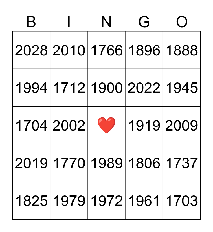 This bingo card has a free space and 32 words: 1961, 1850, 2002, 1909, 2019, 1712, 1888, 1737, 2010, 1954, 1900, 1766, 1842, 1809, 1919, 1972, 1825, 1704, 1989, 1770, 1806, 1968, 2009, 1979, 1703, 1896, 2022, 1994, 2028, 1972, 2005 and 1945.
