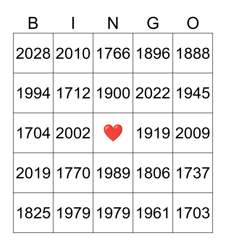 This bingo card has a free space and 32 words: 1961, 1850, 2002, 1909, 2019, 1712, 1888, 1737, 2010, 1954, 1900, 1766, 1842, 1809, 1919, 1972, 1825, 1704, 1989, 1770, 1806, 1968, 2009, 1979, 1703, 1896, 2022, 1994, 2028, 1979, 2005 and 1945.