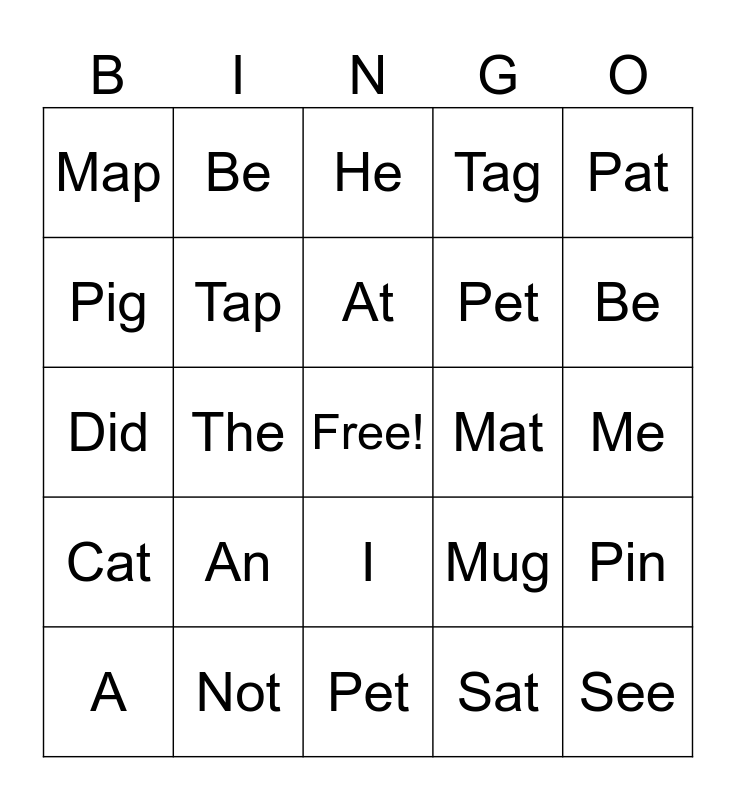 This bingo card has a free space and 24 words: An, Not, At, A, Pat, Map, Pig, Be, Mat, I, Pet, Did, Mug, Pin, Tap, Sat, Me, He, Be, The, See, Cat, Tag and Pet.