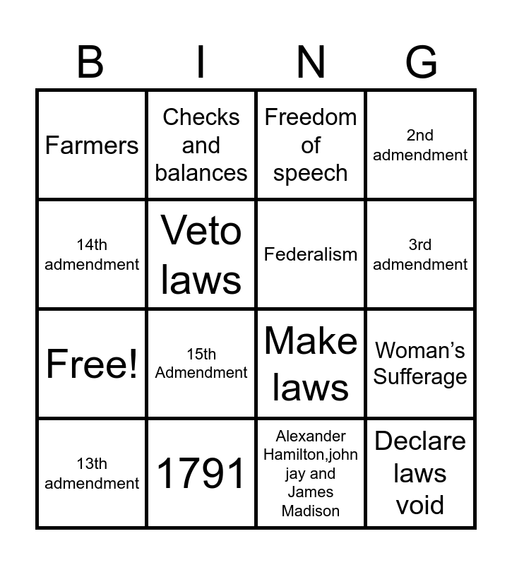This bingo card has 20 words: Woman’s Sufferage, Preamble, Freedom of speech, Bill of rights, 13th admendment, 14th admendment, 1791, Farmers, Free!, Checks and balances, 15th Admendment, Make laws, Veto laws, Declare laws void, Federalism, 5th admendment, 3rd admendment, 2nd admendment, Alexander Hamilton,john jay and James Madison and 4th admendment.