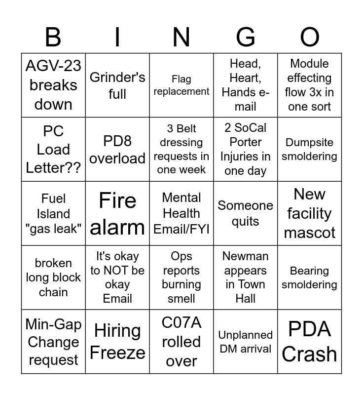 This bingo card has a free space and 24 words: It's okay to NOT be okay Email, Hiring Freeze, 3 Belt dressing requests in one week, Min-Gap Change request, Module effecting flow 3x in one sort, AGV-23 breaks down, PC Load Letter??, Grinder's full, Someone quits, Ops reports burning smell, 2 SoCal Porter Injuries in one day, Fuel Island "gas leak", Newman appears in Town Hall, Bearing smoldering, PD8 overload, Unplanned DM arrival, New facility mascot, Flag replacement, Dumpsite smoldering, Fire alarm, PDA Crash, broken long block chain, Head, Heart, Hands e-mail and C07A rolled over.