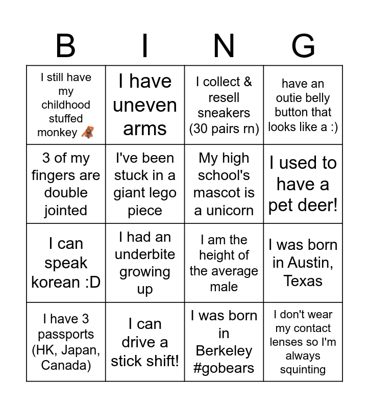 This bingo card has 16 words: I can drive a stick shift!, I was born in Austin, Texas, I collect & resell sneakers (30 pairs rn), I still have my childhood stuffed monkey 🦧, I can speak korean :D, I have uneven arms, I am the height of the average male, I was born in Berkeley #gobears, 3 of my fingers are double jointed, I've been stuck in a giant lego piece, I have 3 passports (HK, Japan, Canada), have an outie belly button that looks like a :), I had an underbite growing up, I used to have a pet deer!, My high school's mascot is a unicorn and I don't wear my contact lenses so I'm always squinting.