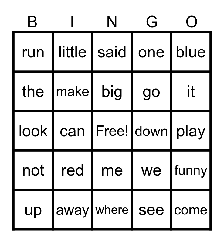 This bingo card has a free space and 40 words: a, look, and, make, away, me, big, my, blue, not, can, one, come, play, down, red, find, run, for, said, funny, see, go, the, help, three, here, to, I, two, in, up, is, we, it, where, jump, yellow, little and you.