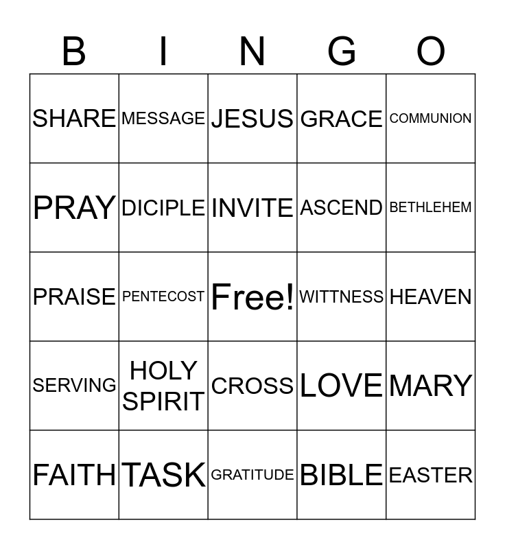 This bingo card has a free space and 24 words: HOLY SPIRIT, TASK, INVITE, FAITH, COMMUNION, SHARE, PRAY, MESSAGE, WITTNESS, CROSS, ASCEND, PRAISE, LOVE, MARY, DICIPLE, BIBLE, HEAVEN, JESUS, BETHLEHEM, PENTECOST, EASTER, SERVING, GRACE and GRATITUDE.