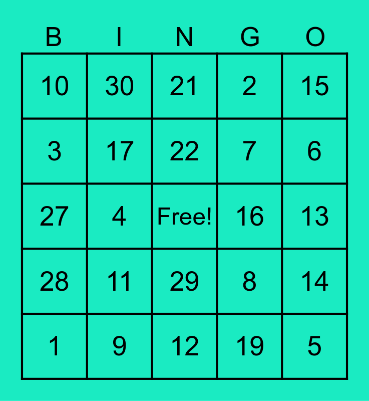 This bingo card has a free space and 24 words: 1, 11, 22, 19, 15, 10, 30, 21, 16, 13, 27, 17, 8, 14, 3, 9, 12, 2, 6, 28, 4, 29, 7 and 5.