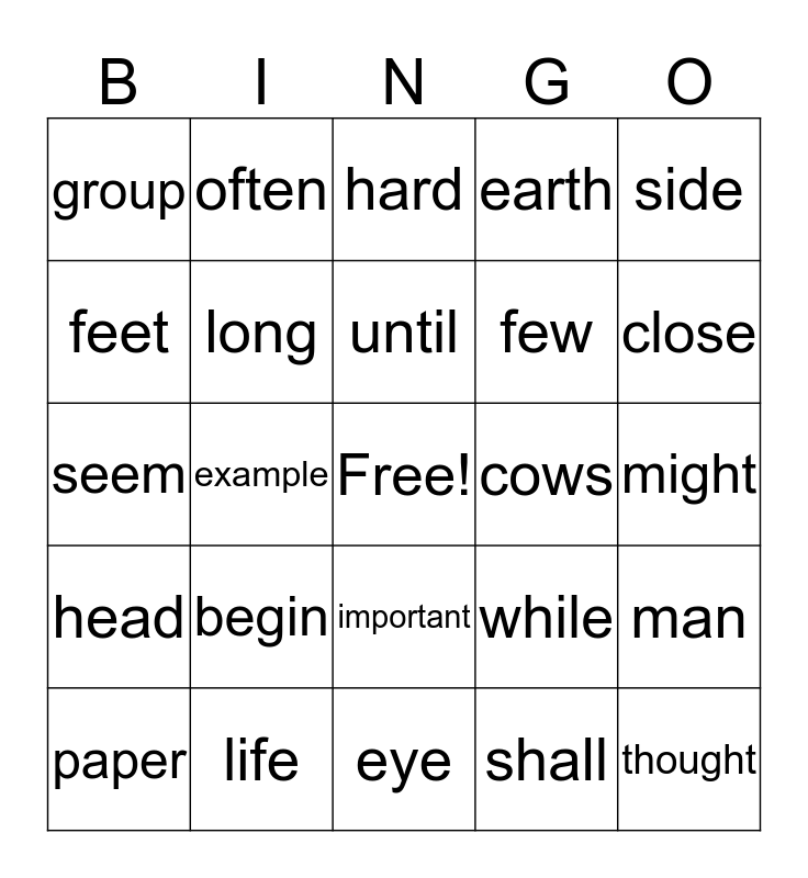 This bingo card has a free space and 24 words: begin, life, until, paper, side, group, feet, often, cows, important, few, seem, while, man, long, shall, might, hard, close, example, thought, head, earth and eye.