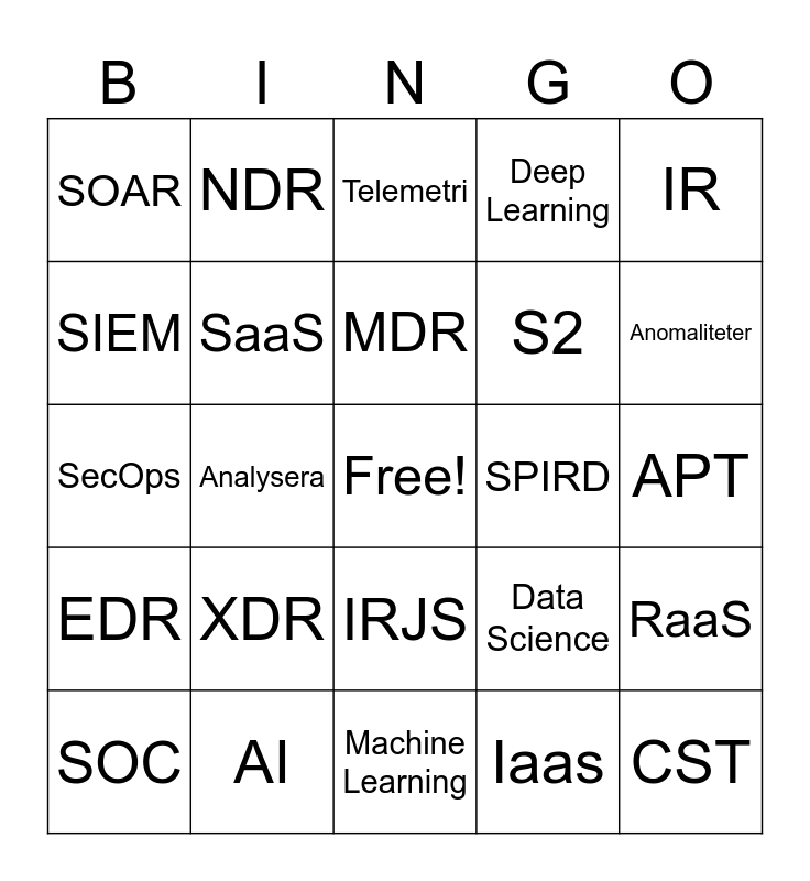 This bingo card has a free space and 24 words: XDR, AI, MDR, SOC, IR, SOAR, SIEM, NDR, SPIRD, IRJS, S2, SecOps, Data Science, RaaS, SaaS, Iaas, APT, Telemetri, Anomaliteter, Analysera, CST, EDR, Deep Learning and Machine Learning.