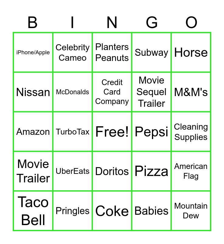 This bingo card has a free space and 34 words: Cats, Babies, Old Spice Deodorant, Talking Animal(s), Movie Trailer, McDonalds, Horse, Taco Bell, Celebrity Cameo, Gatorade, Credit Card Company, Planters Peanuts, Ford, Insurance Company, Pepsi, M&M's, Pringles, Amazon, UberEats, Pizza, Doritos, Snickers, iPhone/Apple, Cleaning Supplies, Coke, Mountain Dew, Subway, Verizon, Movie Sequel Trailer, Nissan, Bubly, TurboTax, American Flag and Chicken Wings.