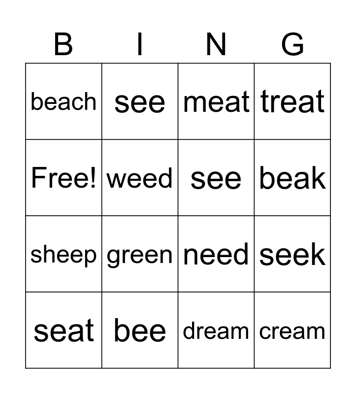 This bingo card has 16 words: bee, seek, meat, beach, sheep, see, need, dream, Free!, weed, seat, treat, green, beak, see and cream.