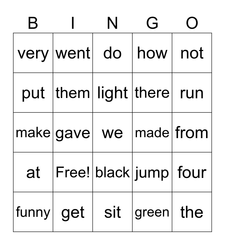 This bingo card has a free space and 24 words: Free!, get, light, funny, not, very, put, went, made, black, there, make, jump, four, them, green, from, do, run, gave, the, at, how and sit.