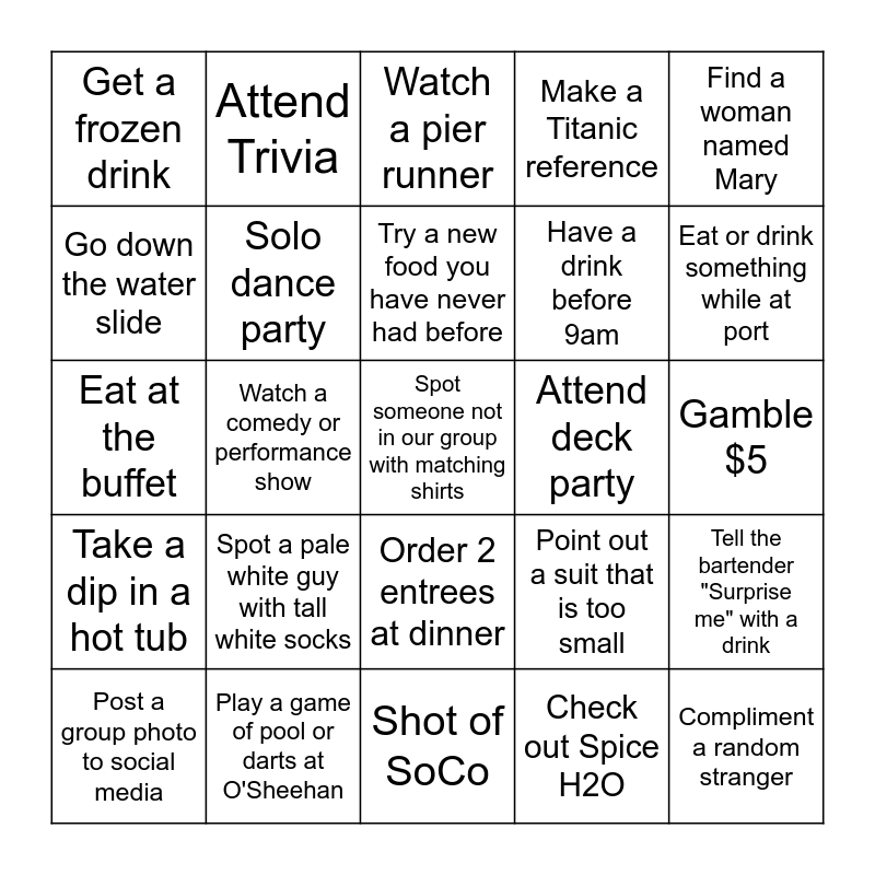 This bingo card has 25 words: Spot a pale white guy with tall white socks, Shot of SoCo, Try a new food you have never had before, Post a group photo to social media, Find a woman named Mary, Get a frozen drink, Go down the water slide, Attend Trivia, Attend deck party, Order 2 entrees at dinner, Have a drink before 9am, Eat at the buffet, Point out a suit that is too small, Tell the bartender "Surprise me" with a drink, Solo dance party, Compliment a random stranger, Gamble $5, Watch a pier runner, Eat or drink something while at port, Watch a comedy or performance show, Spot someone not in our group with matching shirts, Play a game of pool or darts at O'Sheehan, Take a dip in a hot tub, Make a Titanic reference and Check out Spice H2O.