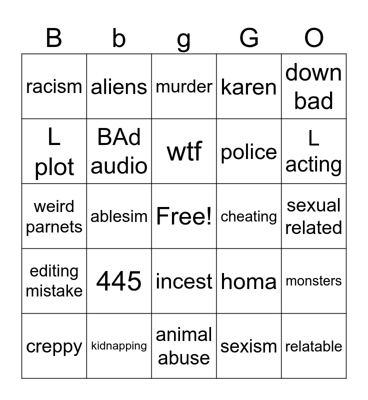 This bingo card has a free space and 24 words: 445, kidnapping, wtf, creppy, down bad, racism, L plot, aliens, cheating, incest, police, weird parnets, homa, monsters, BAd audio, sexism, sexual related, murder, L acting, ablesim, relatable, editing mistake, karen and animal abuse.