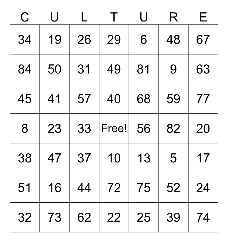 This bingo card has a free space and 85 words: 1, 16, 31, 46, 61, 2, 17, 32, 47, 62, 3, 18, 48, 63, 4, 19, 33, 49, 64, 5, 20, 34, 50, 65, 6, 21, 35, 51, 66, 7, 22, 36, 52, 67, 8, 23, 37, 53, 68, 9, 24, 38, 54, 69, 10, 25, 39, 55, 70, 11, 26, 40, 56, 71, 12, 27, 41, 57, 72, 13, 28, 42, 58, 73, 14, 29, 43, 59, 74, 15, 30, 44, 60, 75, 76, 77, 45, 78, 79, 80, 81, 82, 83, 84 and 85.
