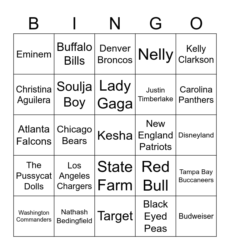 This bingo card has 59 words: Katy Perry, Nathash Bedingfield, Jason Derulo, The Pussycat Dolls, Black Eyed Peas, Kelis, Soulja Boy, Gwen Stefani, Justin Timberlake, Jordin Sparks, Nelly, Beyonce, Christina Aguilera, P!nk, Rihanna, Eminem, Kesha, Kelly Clarkson, Flo Rida, Lady Gaga, New England Patriots, Denver Broncos, Washington Commanders, Tampa Bay Buccaneers, Miami Dolphins, Jacksonville Jaguars, Seattle Seahawks, Baltimore Ravens, Carolina Panthers, Arizona Cardinals, Kansas City Chiefs, Philadelphia Eagles, San Francisco 49ers, Minnesota Vikings, Buffalo Bills, Indianapolis Colts, Green Bay Packers, Chicago Bears, Detroit Lions, Atlanta Falcons, New Orleans Saints, Los Angeles Chargers, Disneyland, Old Spice, Allstate, Capital One, Staples, Verizon, State Farm, Target, Bounty, Ford, Geico, Olive Garden, Wheaties, Red Bull, Campbell’s Soup, Budweiser and Jimmy John’s.