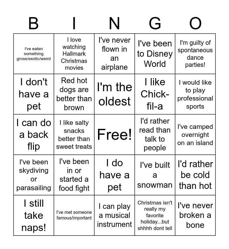 This bingo card has a free space and 24 words: I've been in or started a food fight, I've met someone famous/important, I'm the oldest, I still take naps!, I'm guilty of spontaneous dance parties!, I've eaten something gross/exotic/weird, I don't have a pet, I love watching Hallmark Christmas movies, I'd rather read than talk to people, I do have a pet, I like Chick-fil-a, I can do a back flip, I've built a snowman, I'd rather be cold than hot, Red hot dogs are better than brown, Christmas isn't really my favorite holiday...but shhhh dont tell, I've camped overnight on an island, I've never flown in an airplane, I would like to play professional sports, I like salty snacks better than sweet treats, I've never broken a bone, I've been skydiving or parasailing, I've been to Disney World and I can play a musical instrument.