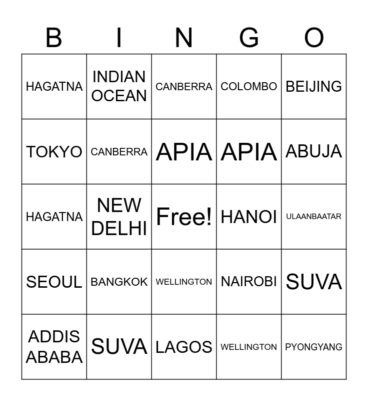 This bingo card has a free space and 40 words: PORT MORESBY, HAGATNA, PAGO PAGO, CANBERRA, SUVA, WELLINGTON, APIA, TOKYO, BEIJING, SEOUL, NEW DELHI, COLOMBO, PYONGYANG, ULAANBAATAR, HANOI, BANGKOK, PORT MORESBY, HAGATNA, PAGO PAGO, CANBERRA, SUVA, WELLINGTON, APIA, TOKYO, BEIJING, SEOUL, NEW DELHI, COLOMBO, PYONGYANG, BANGKOK, JAKARTA, ADDIS ABABA, MOGADISHU, NAIROBI, ABUJA, LAGOS, CAPE TOWN, PACIFIC OCEAN, INDIAN OCEAN and ATLANTIC OCEAN.