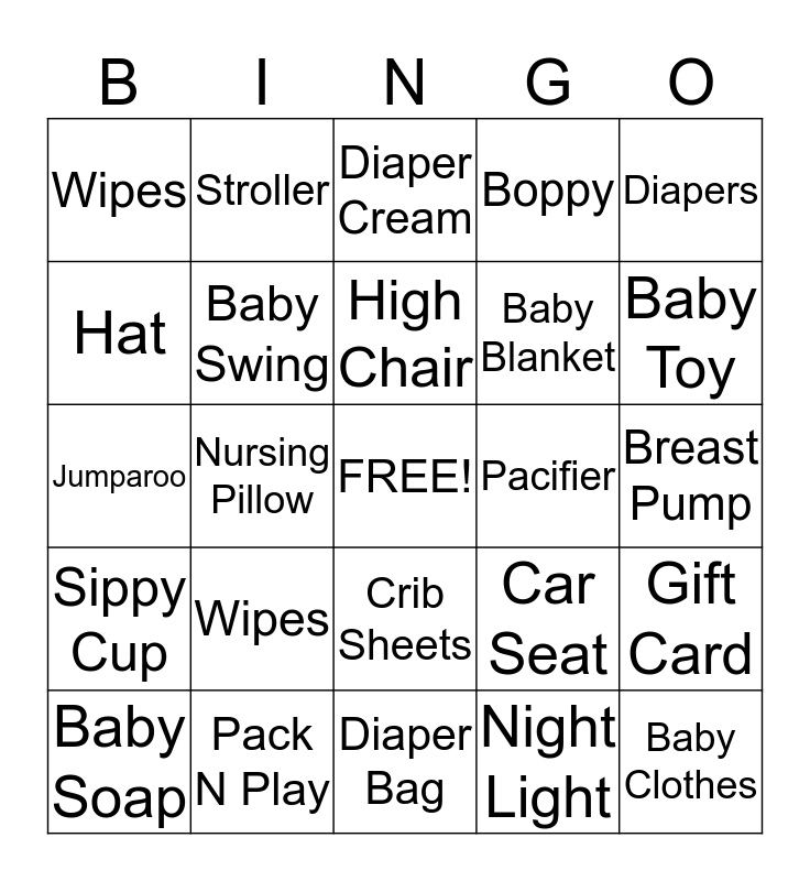 This bingo card has a free space and 24 words: Wipes, Pack N Play, High Chair, Baby Soap, Diapers, Wipes, Hat, Stroller, Pacifier, Crib Sheets, Baby Blanket, Jumparoo, Car Seat, Gift Card, Baby Swing, Night Light, Breast Pump, Diaper Cream, Baby Toy, Nursing Pillow, Baby Clothes, Sippy Cup, Boppy and Diaper Bag.
