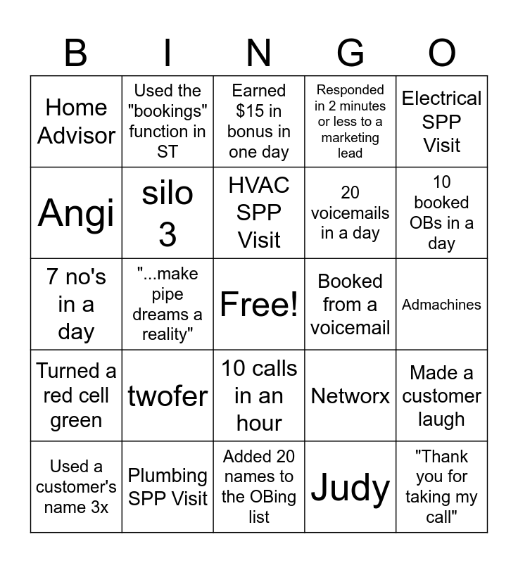 This bingo card has a free space and 26 words: 10 calls in an hour, Judy, HVAC SPP Visit, Plumbing SPP Visit, Electrical SPP Visit, Home Advisor, Angi, Used the "bookings" function in ST, Admachines, Networx, 20 voicemails in a day, 7 no's in a day, Made a customer laugh, Used a customer's name 3x, "...make pipe dreams a reality", direct transferred to dispatcher for same day scheduling, Responded in 2 minutes or less to a marketing lead, Turned a red cell green, Earned $15 in bonus in one day, "Thank you for taking my call", 10 booked OBs in a day, Added 20 names to the OBing list, Booked from a voicemail, twofer, silo 3 and 8+ hwh.