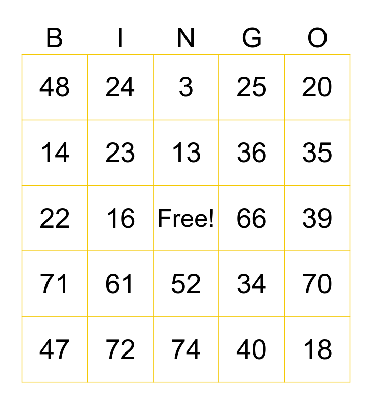This bingo card has a free space and 75 words: 1, 2, 3, 4, 5, 6, 7, 8, 9, 10, 11, 12, 13, 14, 15, 16, 17, 18, 19, 20, 21, 22, 23, 24, 25, 26, 27, 28, 29, 30, 31, 32, 33, 34, 35, 36, 37, 38, 39, 40, 41, 42, 43, 44, 45, 46, 47, 48, 49, 50, 51, 52, 53, 54, 55, 56, 57, 58, 59, 60, 61, 62, 63, 64, 65, 66, 67, 68, 69, 70, 71, 72, 73, 74 and 75.