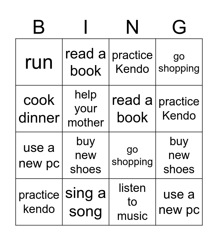 ⚠ This card has duplicate items: sing a song (3), watch a movie (3), read a book (3), run (3), study French (3), practice Kendo (2), help your mother (3), cook dinner (3), use a new pc (3), buy new shoes (3), go shopping (3), practice kendo (2), see my dog (2)