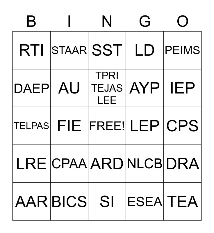 This bingo card has a free space and 24 words: CPAA, BICS, TPRI TEJAS LEE, AAR, PEIMS, RTI, DAEP, STAAR, LEP, ARD, AYP, TELPAS, NLCB, DRA, AU, ESEA, CPS, SST, IEP, FIE, TEA, LRE, LD and SI.