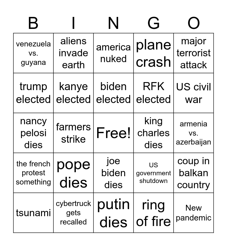 This bingo card has a free space and 44 words: zane gets a job, New pandemic, volcano errupts, tsunami, super rare eclipse, ring of fire, america nuked, major racial violence in US, major terrorist attack, cybertruck gets recalled, plane crash, king charles dies, joe biden dies, pope dies, jimmy carter dies, putin dies, mitch mcconnell dies, nancy pelosi dies, china vs. taiwan, US civil war, aliens invade earth, major war in middle east, ethiopia vs. sudan, venezuela vs. guyana, india vs. china, armenia vs. azerbaijan, argentina vs. falklands, trump convicted, US government shutdown, the french protest something, twitter goes bankrupt, coup in balkan country, quebec independence, railroad union strikes, farmers strike, russia annexes belarus, labour majority in UK, texas independence, biden elected, trump elected, RFK elected, first woman president, kanye elected and lemon gets his license.