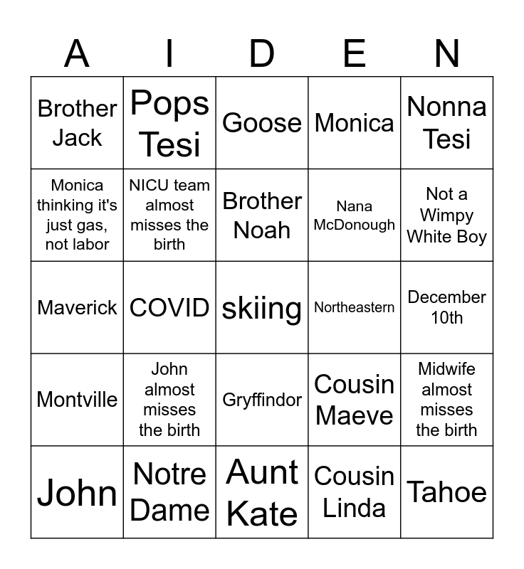 This bingo card has a free space and 24 words: John almost misses the birth, Notre Dame, Brother Noah, John, Nonna Tesi, Brother Jack, Monica thinking it's just gas, not labor, Pops Tesi, Northeastern, Gryffindor, Nana McDonough, Maverick, Cousin Maeve, Midwife almost misses the birth, NICU team almost misses the birth, Cousin Linda, December 10th, Goose, Not a Wimpy White Boy, COVID, Tahoe, Montville, Monica and Aunt Kate.
