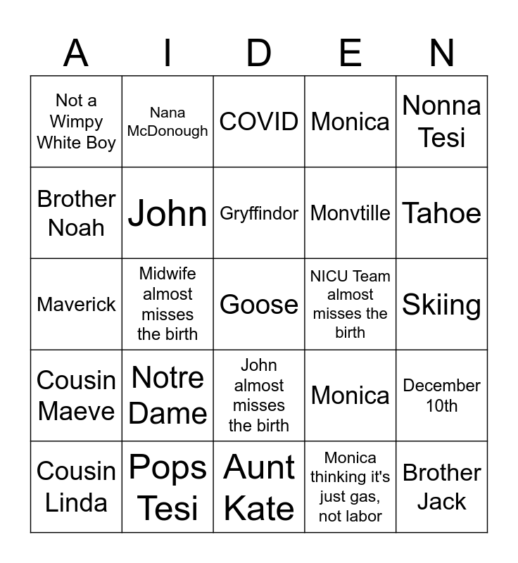 This bingo card has 25 words: Notre Dame, Aunt Kate, Gryffindor, Cousin Linda, Nonna Tesi, Not a Wimpy White Boy, Brother Noah, Nana McDonough, NICU Team almost misses the birth, John almost misses the birth, Monvtille, Maverick, Monica, December 10th, John, Brother Jack, Skiing, COVID, Tahoe, Midwife almost misses the birth, Goose, Pops Tesi, Cousin Maeve, Monica and Monica thinking it's just gas, not labor.
