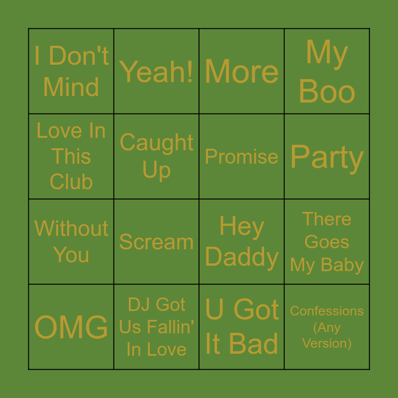 This bingo card has 16 words: OMG, DJ Got Us Fallin' In Love, More, My Boo, Love In This Club, Yeah!, Hey Daddy, There Goes My Baby, I Don't Mind, Caught Up, U Got It Bad, Party, Without You, Scream, Promise and Confessions (Any Version).