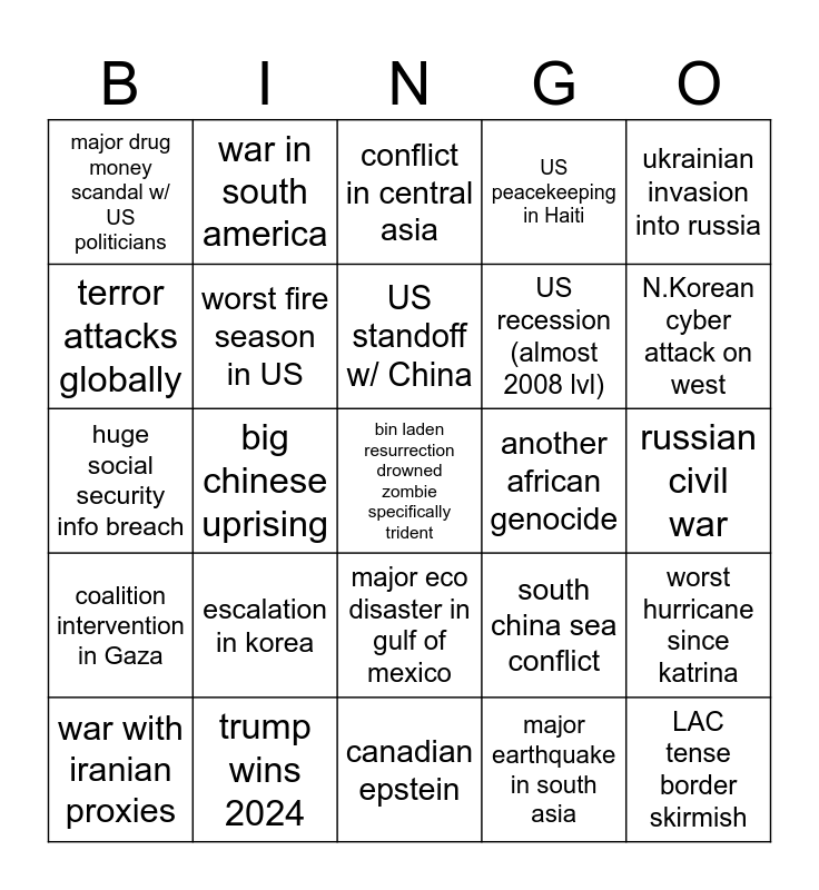 This bingo card has a free space and 24 words: escalation in korea, trump wins 2024, US standoff w/ China, war with iranian proxies, ukrainian invasion into russia, major drug money scandal w/ US politicians, terror attacks globally, war in south america, another african genocide, major eco disaster in gulf of mexico, US recession (almost 2008 lvl), huge social security info breach, south china sea conflict, worst hurricane since katrina, worst fire season in US, major earthquake in south asia, russian civil war, conflict in central asia, N.Korean cyber attack on west, big chinese uprising, LAC tense border skirmish, coalition intervention in Gaza, US peacekeeping in Haiti and canadian epstein.