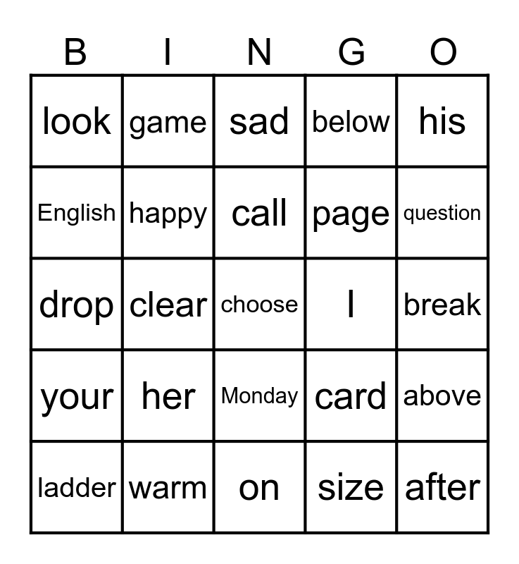 This bingo card has 30 words: warm, and, clear, away, look, sad, happy, Monday, I, on, break, choose, size, after, question, enter, card, your, her, his, drop, play, game, page, English, below, above, ladder, call and would.