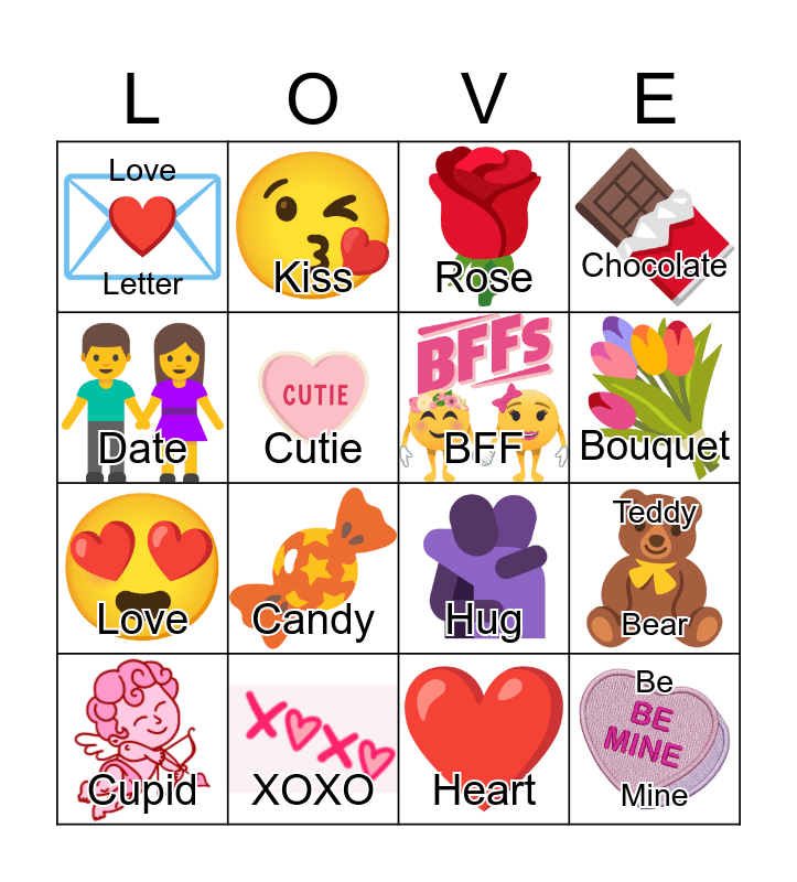 This bingo card has 16 images and 16 words: XOXO, Teddy Bear, Rose, Love Letter, Love, Kiss, Hug, Heart, Date, Cutie, Cupid, Chocolate, Candy, Bouquet, BFF and Be Mine.