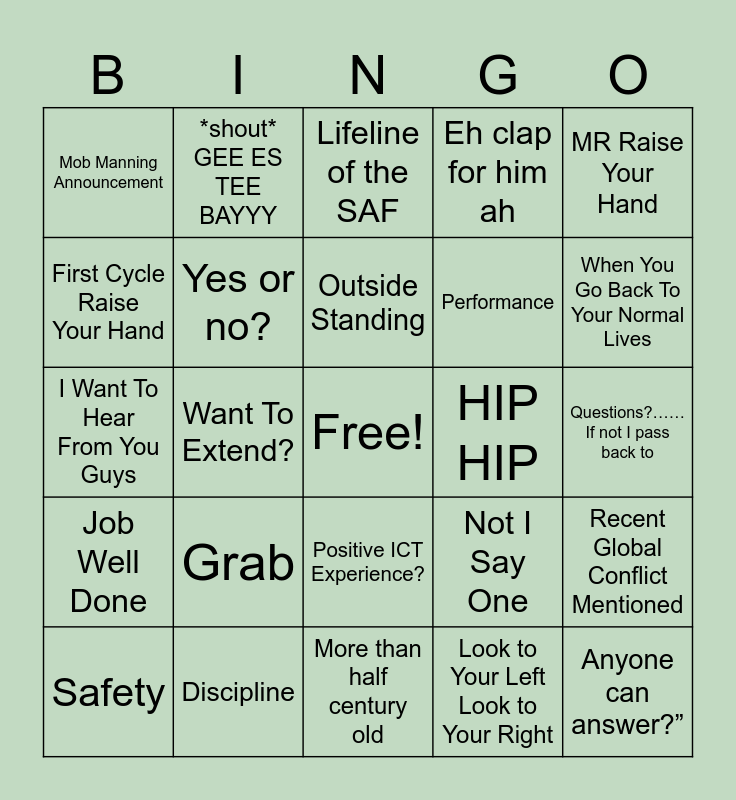 This bingo card has a free space and 24 words: Safety, Grab, Outside Standing, Look to Your Left Look to Your Right, MR Raise Your Hand, Mob Manning Announcement, *shout* GEE ES TEE BAYYY, Lifeline of the SAF, HIP HIP, Questions?……If not I pass back to, I Want To Hear From You Guys, Yes or no?, Not I Say One, Recent Global Conflict Mentioned, First Cycle Raise Your Hand, Discipline, More than half century old, Eh clap for him ah, When You Go Back To Your Normal Lives, Job Well Done, Want To Extend?, Positive ICT Experience?, Performance and Anyone can answer?”.