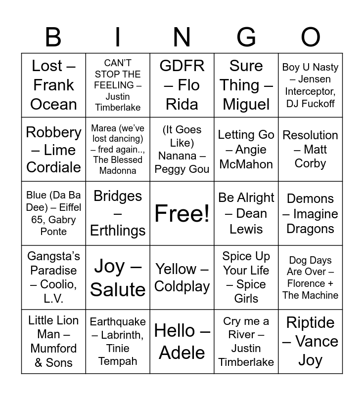 This bingo card has a free space and 38 words: Tangerine – Noah Richardson, The Difference – Flume, Toro y Moi, Poison – Tia Gostelow, Marea (we’ve lost dancing) – fred again.., The Blessed Madonna, Dog Days Are Over – Florence + The Machine, Joy – Salute, (It Goes Like) Nanana – Peggy Gou, Say Nothing – Mall Grab, Boy U Nasty – Jensen Interceptor, DJ Fuckoff, Letting Go – Angie McMahon, Bridges – Erthlings, Sure Thing – Miguel, Riptide – Vance Joy, Demons – Imagine Dragons, Robbery – Lime Cordiale, Gangsta’s Paradise – Coolio, L.V., Mambo No. 5 (a little bit of…) - Lou Bega, GDFR – Flo Rida, Happier – marshmello, Bastille, Be Alright – Dean Lewis, Lost – Frank Ocean, Earthquake – Labrinth, Tinie Tempah, Resolution – Matt Corby, Little Lion Man – Mumford & Sons, Wake Me Up When September Ends – Green Day, Hello – Adele, WILD – Troye Sivan, Bloodstream – Ed Sheeran, 21 Guns – Green Day, Tiny Dancer – Elton John, Safe and Sound – Capital Cities, Yellow – Coldplay, Cry me a River – Justin Timberlake, CAN’T STOP THE FEELING – Justin Timberlake, Hey Ya! – Outkast, Spice Up Your Life – Spice Girls, Blue (Da Ba Dee) – Eiffel 65, Gabry Ponte and Bad Habit – Steve Lacy.