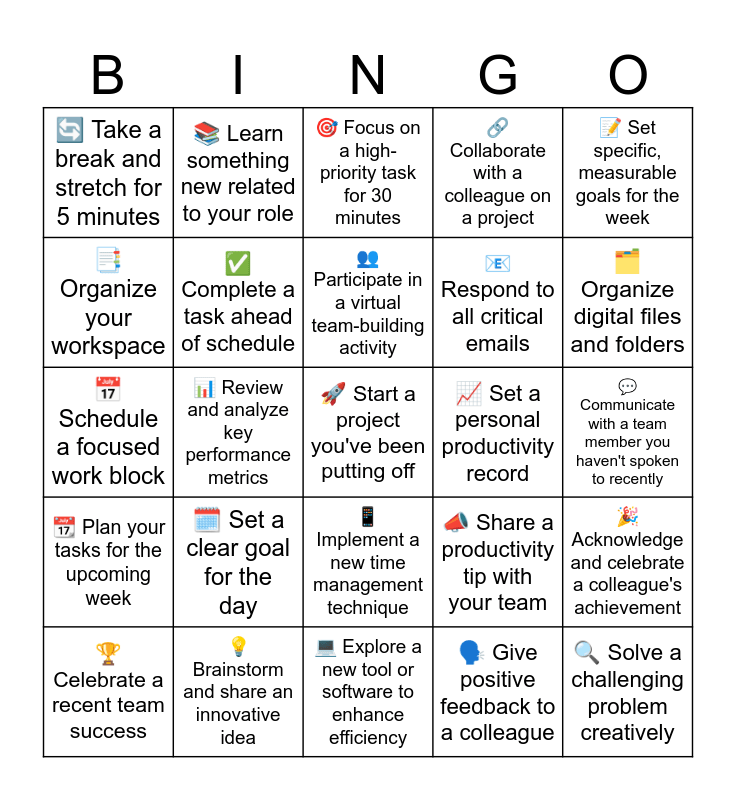 This bingo card has a free space and 24 words: 🗓️ Set a clear goal for the day, 💡 Brainstorm and share an innovative idea, 👥 Participate in a virtual team-building activity, 🏆 Celebrate a recent team success, 📝 Set specific, measurable goals for the week, 🔄 Take a break and stretch for 5 minutes, 📑 Organize your workspace, 📚 Learn something new related to your role, 📈 Set a personal productivity record, 📱 Implement a new time management technique, 📧 Respond to all critical emails, 📅 Schedule a focused work block, 📣 Share a productivity tip with your team, 🎉 Acknowledge and celebrate a colleague's achievement, ✅ Complete a task ahead of schedule, 🗣️ Give positive feedback to a colleague, 💬 Communicate with a team member you haven't spoken to recently, 🎯 Focus on a high-priority task for 30 minutes, 🗂️ Organize digital files and folders, 📊 Review and analyze key performance metrics, 🔍 Solve a challenging problem creatively, 📆 Plan your tasks for the upcoming week, 🔗 Collaborate with a colleague on a project and 💻 Explore a new tool or software to enhance efficiency.