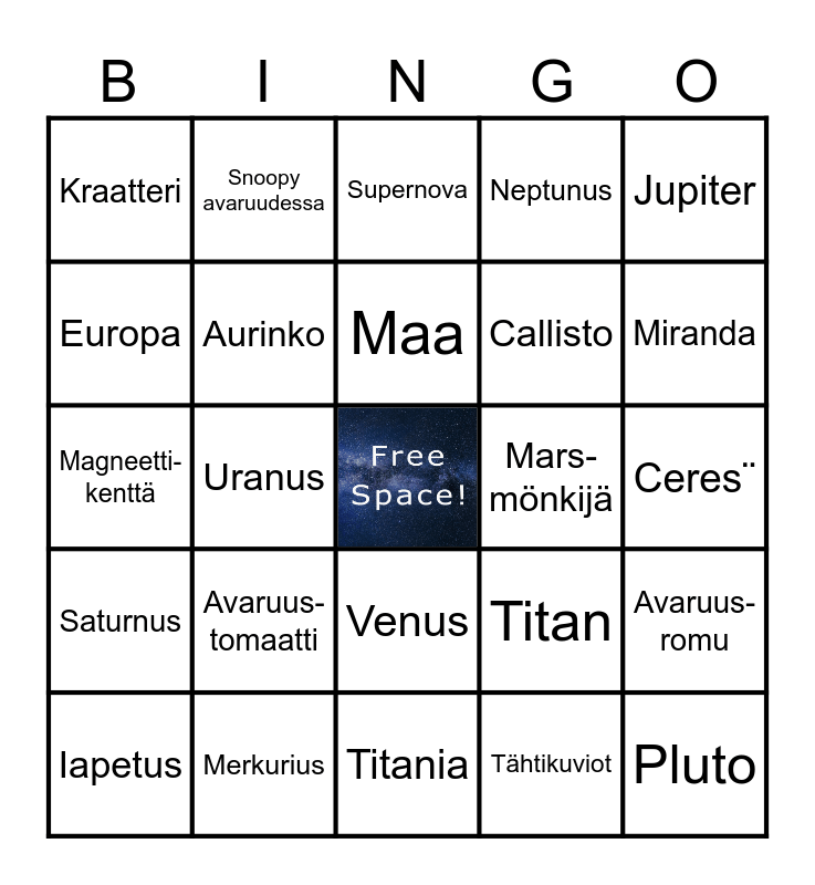 This bingo card has a free space and 40 words: Revontulet, Magneetti- kenttä, Galaksi, Aurinko, Merkurius, Venus, Maa, Mars, Jupiter, Saturnus, Uranus, Neptunus, Pluto, Ceres¨, Mars- mönkijä, Avaruus- tomaatti, Avaruus- teleskooppi, Kraatteri, Kölin sumu, Supernova, Avaruus- romu, Tähtikuviot, Callisto, Europa, Enceladus, Kepler-9b, TRAPPIST-1f, Ganymedes, Charon, Kuu, Io, Iapetus, Mimas, Titan, Miranda, Titania, Triton, Avaruus- vessa, Snoopy avaruudessa and Musta aukko.