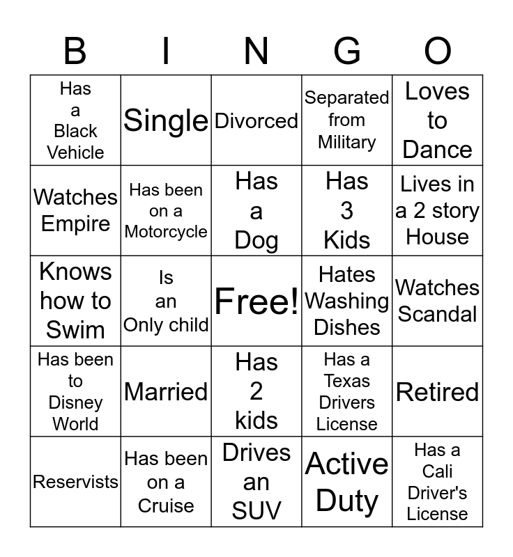 This bingo card has a free space and 24 words: Married, Has been on a Cruise, Has a Dog, Reservists, Loves to Dance, Has a Black Vehicle, Watches Empire, Single, Hates Washing Dishes, Has 2 kids, Has 3 Kids, Knows how to Swim, Has a Texas Drivers License, Retired, Has been on a Motorcycle, Active Duty, Watches Scandal, Divorced, Lives in a 2 story House, Is an Only child, Has a Cali Driver's License, Has been to Disney World, Separated from Military and Drives an SUV.
