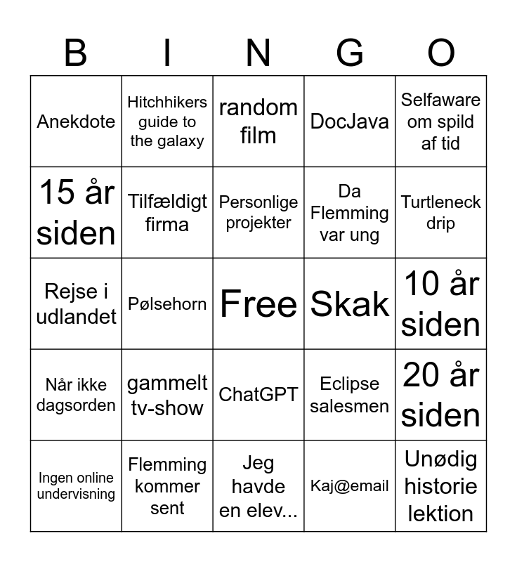This bingo card has a free space and 25 words: gammelt tv-show, Jeg havde en elev..., Personlige projekter, Ingen online undervisning, Selfaware om spild af tid, Anekdote, 15 år siden, Hitchhikers guide to the galaxy, Skak, ChatGPT, Da Flemming var ung, Rejse i udlandet, Eclipse salesmen, 20 år siden, Tilfældigt firma, Brok om tavlen, 10 år siden, random film, Turtleneck drip, Pølsehorn, Unødig historie lektion, Flemming kommer sent, Når ikke dagsorden, DocJava and Kaj@email.