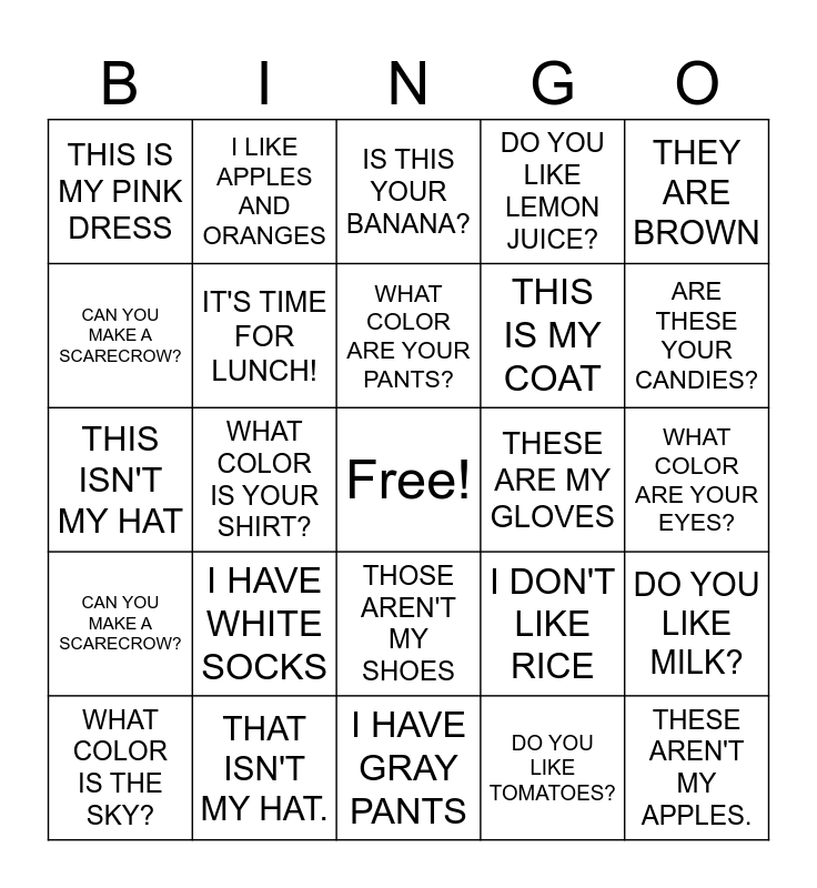 This bingo card has a free space and 24 words: I HAVE WHITE SOCKS, THAT ISN'T MY HAT., WHAT COLOR ARE YOUR PANTS?, WHAT COLOR IS THE SKY?, THEY ARE BROWN, THIS IS MY PINK DRESS, CAN YOU MAKE A SCARECROW?, I LIKE APPLES AND ORANGES, THESE ARE MY GLOVES, THOSE AREN'T MY SHOES, THIS IS MY COAT, THIS ISN'T MY HAT, I DON'T LIKE RICE, DO YOU LIKE MILK?, IT'S TIME FOR LUNCH!, DO YOU LIKE TOMATOES?, WHAT COLOR ARE YOUR EYES?, IS THIS YOUR BANANA?, ARE THESE YOUR CANDIES?, WHAT COLOR IS YOUR SHIRT?, THESE AREN'T MY APPLES., CAN YOU MAKE A SCARECROW?, DO YOU LIKE LEMON JUICE? and I HAVE GRAY PANTS.