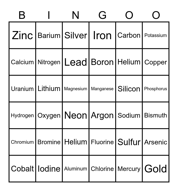 This bingo card has 36 words: Fluorine, Helium, Chlorine, Calcium, Hydrogen, Manganese, Nitrogen, Aluminum, Carbon, Sulfur, Copper, Iron, Arsenic, Lithium, Boron, Zinc, Chromium, Silicon, Uranium, Silver, Magnesium, Oxygen, Argon, Neon, Sodium, Barium, Helium, Iodine, Lead, Potassium, Gold, Cobalt, Bismuth, Phosphorus, Bromine and Mercury.