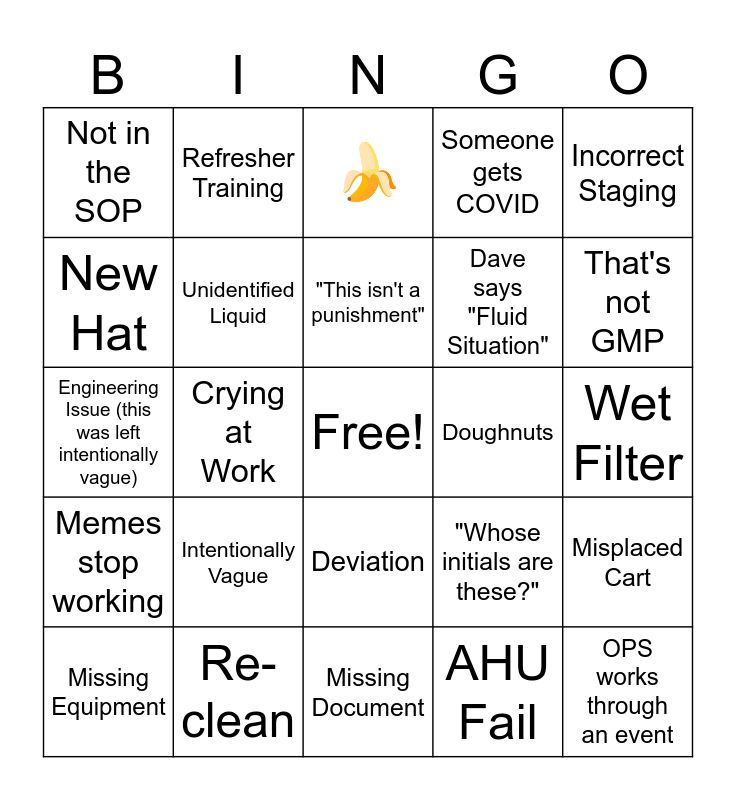 This bingo card has a free space and 24 words: Intentionally Vague, Re-clean, "This isn't a punishment", Missing Equipment, Incorrect Staging, Not in the SOP, New Hat, Refresher Training, Doughnuts, Deviation, Dave says "Fluid Situation", Engineering Issue (this was left intentionally vague), "Whose initials are these?", Misplaced Cart, Unidentified Liquid, AHU Fail, Wet Filter, 🍌, That's not GMP, Crying at Work, OPS works through an event, Memes stop working, Someone gets COVID and Missing Document.